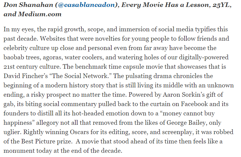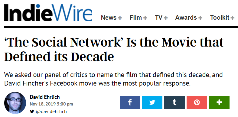 Yowzers! Talk about a big question with a zillion angles. I know the interpretation of “defined” was open, but when I think of the 2010s, the boom of social media is too large to ignore. David Fincher’s The Social Network, while semi-historical before this decade, still feels like the lightening rod and torch bearer for this decade. If it wasn’t this, it was going to be The Avengers and what it did for its genre and the whole industry.