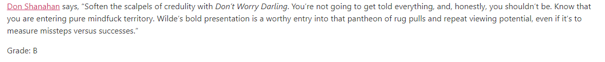 MEDIA APPEARANCE: Included in Hollywood Critics Association "Gradebook" for "Don't Worry Darling"