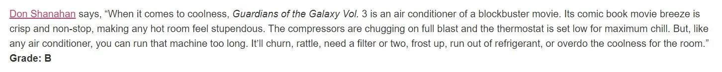 Upon being accepted into the Hollywood Critics Association, their fine site-runners and admins assemble “Gradebooks” collecting early reviews and grades from their critics on popular releases. When I can get more work completed and a review submitted early enough, my take and connected quotes have the chance to make these shout-out posts. My newest was being included for Guardians of the Galaxy Vol. 3. Check out your boy!