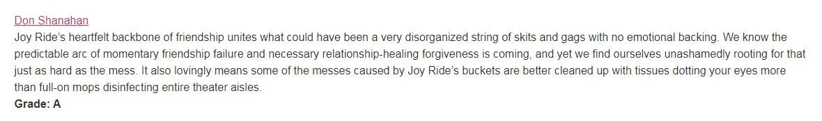 Upon being accepted into the Hollywood Critics Association, their fine site-runners and admins assemble “Gradebooks” collecting early reviews and grades from their critics on popular releases. When I can get more work completed and a review submitted early enough, my take and connected quotes have the chance to make these shout-out posts. My newest was being included for Joy Ride. Check out your boy!