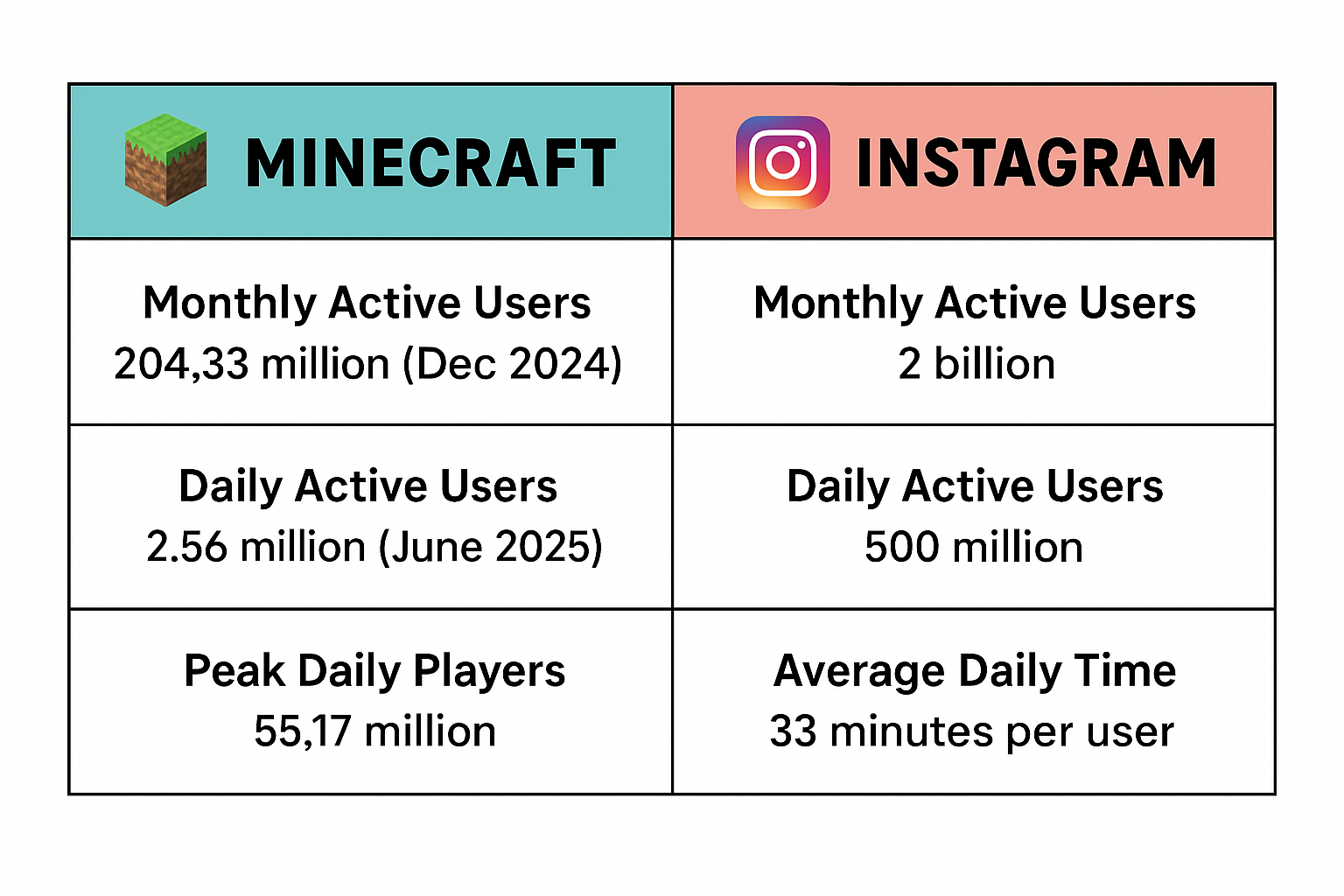 Minecraft’s engagement graph shows steady growth and seasonal peaks tied to content drops, while Instagram remains massive; its per-user time is limited to short sessions of scrolling and viewing Stories.