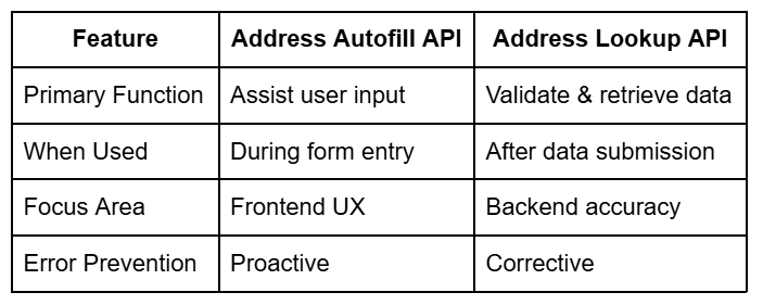 Unlike basic autofill features built into browsers, an API-based solution uses authoritative postal data to ensure accuracy, standardization, and deliverability.