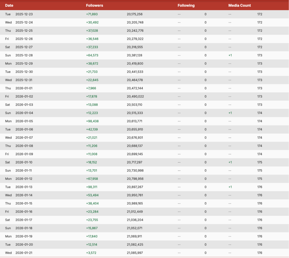 Chalamet’s girlfriend, Kylie Jenner, has also seen boosts to her Instagram following the Critic’s Choice and Golden Globes, gaining 48,751 followers on January 5th and 69,417 on January 12th.