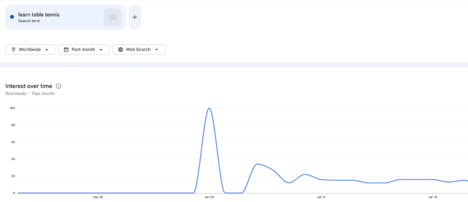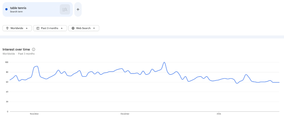 While table tennis has enjoyed a good amount of interest across the globe, examining Google Trends shows a spike of 43.75% in November, followed by a gradual climb and another spike of 56.25% in December.