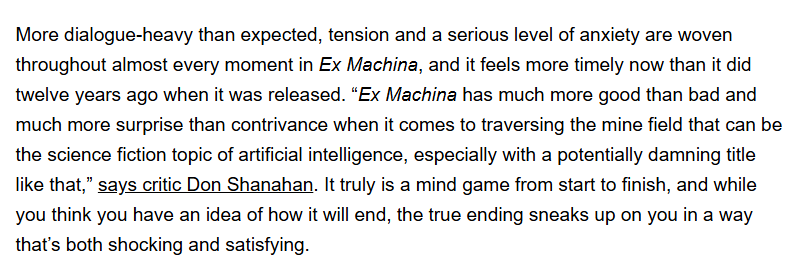 It took receiving a Google Alert on my name to see that a few quotes of mine about 2015’s twisty sci-fi potboiler Ex Machina were recently cited on the media site ComicBook.com. The piece written by film and TV writer Alex Ros promoted the film’s streaming departure from HBO Max. The quotes from my review on Every Movie Has a Lesson. They didn’t ask for my permission, but I don’t mind. Thanks for the reference and clicks, and check out your boy!