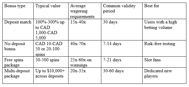 Multi-peposit package. This reward is spread across 2-5 deposits and potentially amounts to tens of thousands of Canadian dollars plus hundreds of free spins.